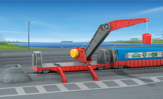 Das Ergänzungsset passt perfekt zur Startpackung. Es beinhaltet einen Kranwagen und einen Containerwagen mit einem großen Container. Außerdem noch zusätzliche Gleise und einen Prellbock als Gleisabschluss für das Abstellgleis.