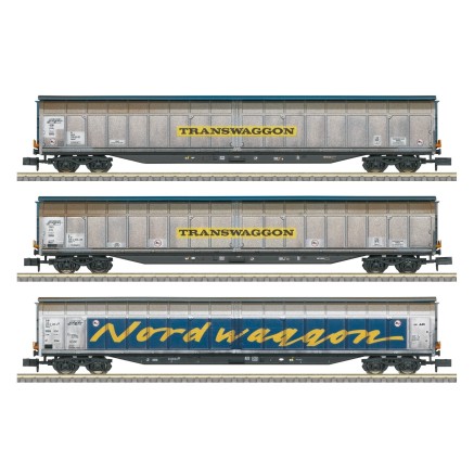 Passend zur BR 140 erscheint ein Wagenset mit Schiebewandwagen des Typs Habins12 in "stark verschmutzter" Ausführung. Ein Wagen ist mit Zugschlussscheiben bedruckt.
